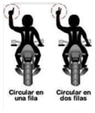 - La moto guía (Capitán de Ruta), en función del tipo de vía por la que circulemos, indicará si es conveniente cambiar la circulación en Zigzag por la Circulación en línea. Para ello, levantará el brazo izquierdo indicando un 1 para la circulación en línea o un 2 para indicar que se circulará en Zigzag. Todos los pilotos replicaran la señal del Capitán de Ruta para que llegue la señal a la última moto (moto escoba).